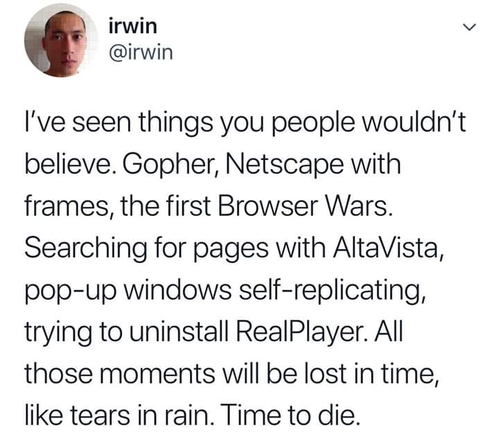Muita gente mais nova não entende bem isso, só quando explico que sou do tempo da TV em preto e branco e vi surgirem o telefone sem fio, o videocassete, cd player, discman, 486, internet discada e o falecido orkut (sdds). Gosto de contar de quando eu trabalhava com sistemas de informação no Tecpar e tudo era mato na internet – leia-se chat e email.