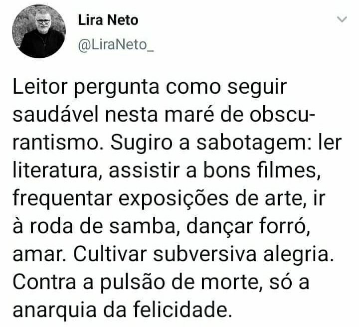 Conhecer o caminho, trilhar o caminho. Cultivar subversiva alegria, mesmo quando o mundo se desmancha a sua volta. Vencer a pulsão de morte, seja ela sua ou de quem te governa. Vencer a pulsão de morte. Para que então possamos reconstruir esse mundo, ou criar um novo. Haja força, haja alegria, haja amor.